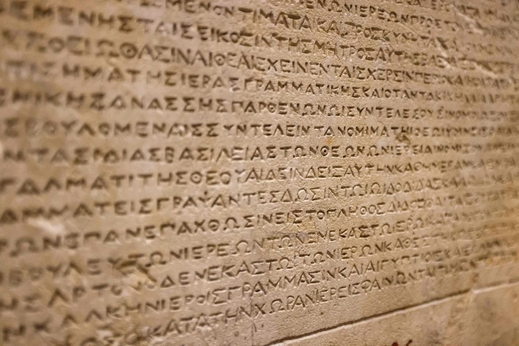 Photo: Inscriptions on one of the steles bearing a copy of the 'Canopus Decree', displaying the Greek portion of its triliteral bilingual text, discovered in 1881 by Gaston Maspero at the site of Kom el-Hisn in Egypt's Nile delta and currently on display at the Egyptian Museum, Cairo, Egypt, 27 September 2022. (Photo by KHALED DESOUKI/AFP via Getty Images.)